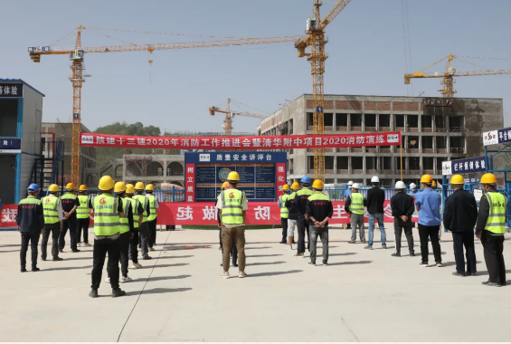 在第19個(gè)全國“安全生產(chǎn)月”之際,為切實(shí)加強(qiáng)項(xiàng)目安全管理工作,提高全員安全防范意識(shí)和自救能力,及時(shí)排除消防安全隱患,防患于未然。5月17日,陜建十三建公司以“消除事故隱患,筑牢安全防線”為主題在清華附中項(xiàng)目舉行2020年消防工作推進(jìn)會(huì)并開展了應(yīng)急消防演練。建設(shè)單位、監(jiān)理單位、現(xiàn)場管理人員等40余人參加。
