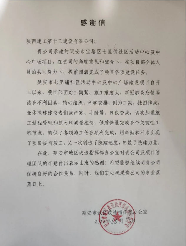 在繼南川河防洪工程、延安大學新校區(qū)體育中心項目之后,10月15日,公司負責施工的延安市七里鋪社區(qū)活動中心及中心廣場項目收到了來自建設單位的感謝信。延安市城區(qū)改造指揮部在感謝信中提到:陜建十三建公司延安寶塔區(qū)七里鋪社區(qū)活動中心及中心廣場項目全體建設者戰(zhàn)嚴寒、斗酷暑,日夜奮戰(zhàn),切實加強施工過程管理和質量控制,保質保量完成了多個關鍵性工程節(jié)點,確保了各項施工任務順利完成,用辛勤和汗水實現(xiàn)了項目提前竣工,又一次創(chuàng)造了陜建速度,彰顯了陜建力量。