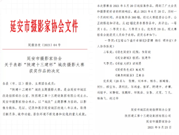 9月29日,由延安市城區(qū)改造指揮部辦公室聯(lián)合陜西建工第十三建設(shè)集團(tuán)有限公司主辦、延安市攝影家協(xié)會承辦的“陜建十三建杯”城改攝影比賽頒獎儀式暨獲獎作品展在延安市小東門廣場圣地影像畫廊圓滿舉行。