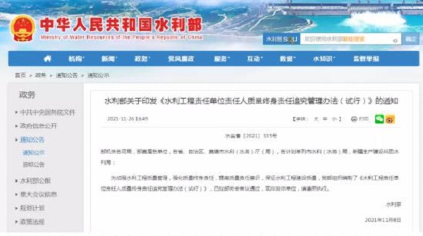 水利部關于印發(fā)《水利工程責任單位責任人質量終身責任追究管理辦法(試行)》的通知