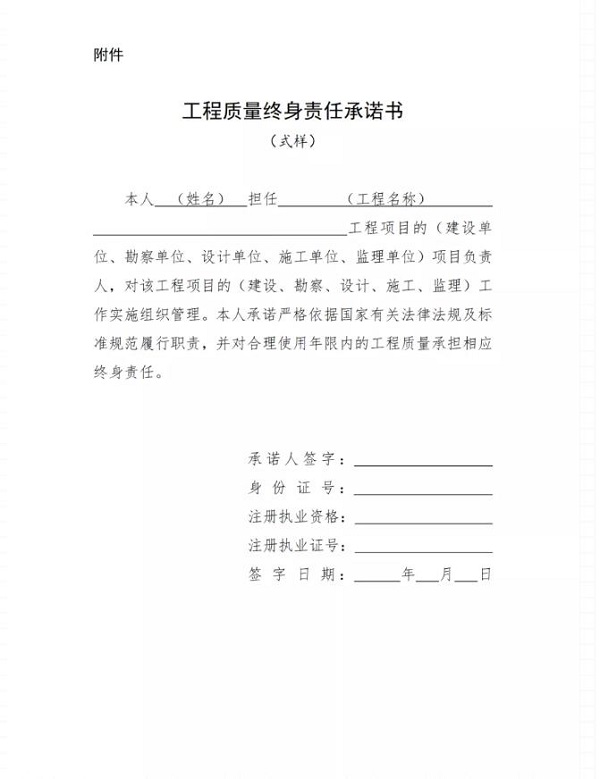 第十二條 項目負責人應當在辦理工程質量監(jiān)督手續(xù)前簽署工程質量終身責任承諾書(式樣參見附件),連同項目負責人證明材料,由建設單位(項目法人)報工程質量監(jiān)督機構備案。項目負責人如有更換的,應按前述規(guī)定重新備案。
