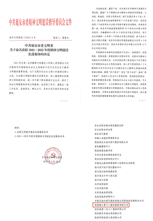 近日,延安市委表彰2021-2022年度精神文明建設(shè)先進(jìn)集體。陜西建工第十三建設(shè)集團(tuán)有限公司被評為“市級文明單位”。