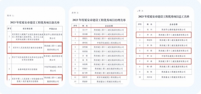 集團(tuán)延安市人民醫(yī)院改擴(kuò)建項目經(jīng)理部、延安市第二人民醫(yī)院(市傳染病??漆t(yī)院)改擴(kuò)建項目經(jīng)理部、陜甘寧邊區(qū)政府保安處革命紀(jì)念館項目經(jīng)理部被評為“2023年度延安市建設(shè)工程優(yōu)秀項目部”;吳小平、雷亞雄、高哲源、張溪強(qiáng)、汪強(qiáng)、湯勇、宋院輝等人被評為“2023年度延安市建設(shè)工程優(yōu)秀項目經(jīng)理”;李杰、忻煜、申虎等人被評為“2023年度延安市建設(shè)工程優(yōu)秀項目總工”。