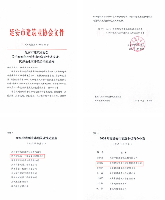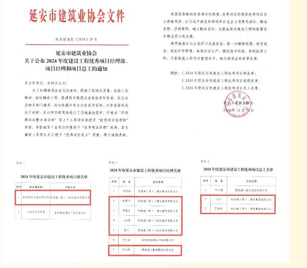 日前,延安市建筑業(yè)協(xié)會(huì)公布了2024年度延安市建筑業(yè)先進(jìn)企業(yè)、優(yōu)秀企業(yè)家、項(xiàng)目經(jīng)理部、項(xiàng)目經(jīng)理、項(xiàng)目總工評(píng)選結(jié)果,陜西建工第十三建設(shè)集團(tuán)有限公司被評(píng)為2024年度延安市建筑業(yè)先進(jìn)企業(yè);集團(tuán)黨委副書(shū)記、總經(jīng)理?xiàng)钣篮晖颈辉u(píng)為優(yōu)秀企業(yè)家;師范路綜合整治項(xiàng)目部被評(píng)為建設(shè)工程優(yōu)秀項(xiàng)目部;雷慧東、上官松、拓振華、袁江、喬戰(zhàn)峰五名同志被評(píng)為優(yōu)秀項(xiàng)目經(jīng)理;汪洋、王海紅兩名同志被評(píng)為優(yōu)秀項(xiàng)目總工。